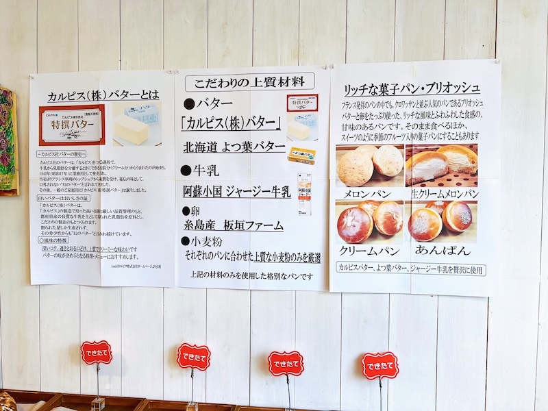 生地に使うバターは「カルピス(株)バター」、「北海道よつ葉バター」、牛乳には「阿蘇小国ジャージー牛乳」、卵には「糸島産 板垣ファーム」のものとこだわりがつまっています。