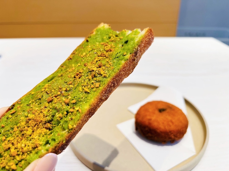 こちらは「ピスタチオボストック(360円)」。バケットの上にピスタチオクリームとブランデーシロップが染み込ませてあり、濃厚なピスタチオの味わいが最高に美味しかったです。