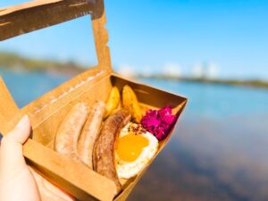 ソーセージのほか、目玉焼きに自家製のマスタード、ポテトにピクルスと大満足なBOXになっています。