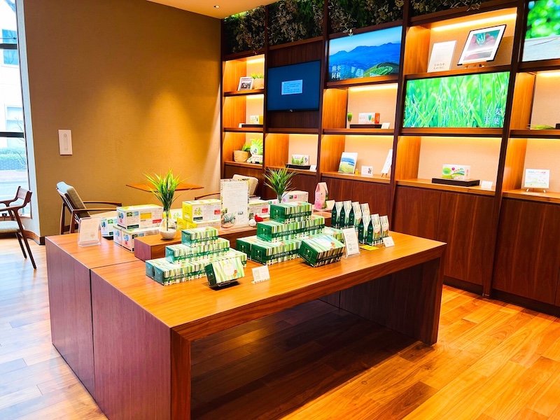 カフェの奧にはアサヒ緑健の商品を購入できるブースもあり、通常は通販で販売されている商品や店舗限定のお試しサイズまで揃っています。