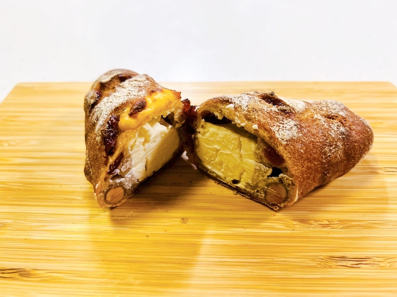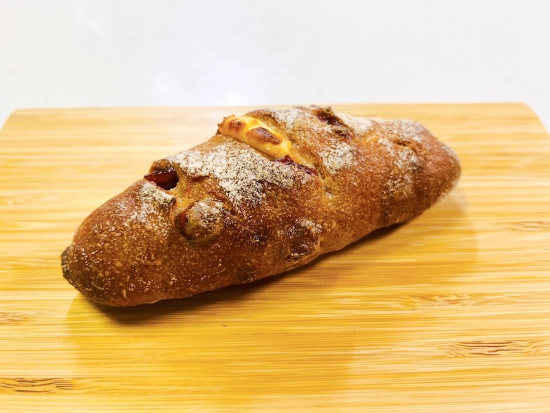 カンパーニュの生地の中にクランベリーと大きなクリームチーズが入っていて、クリーミーな甘みが病みつきに!