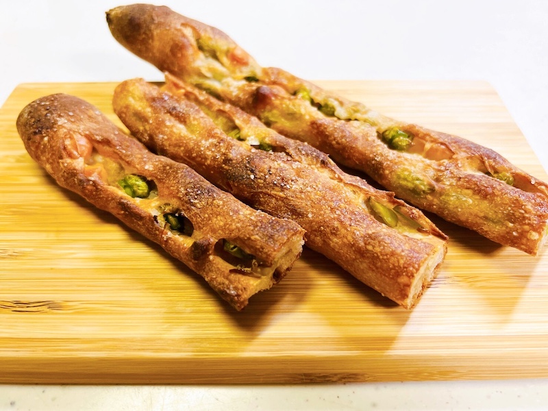 お店を出るお客さんが持っている袋から飛び出した包み紙…なんだろうと気になっていましたが、その正体がこちらの人気商品「ビーノ(286円)」!長細いハードパンの中には枝豆とチーズが入っています。