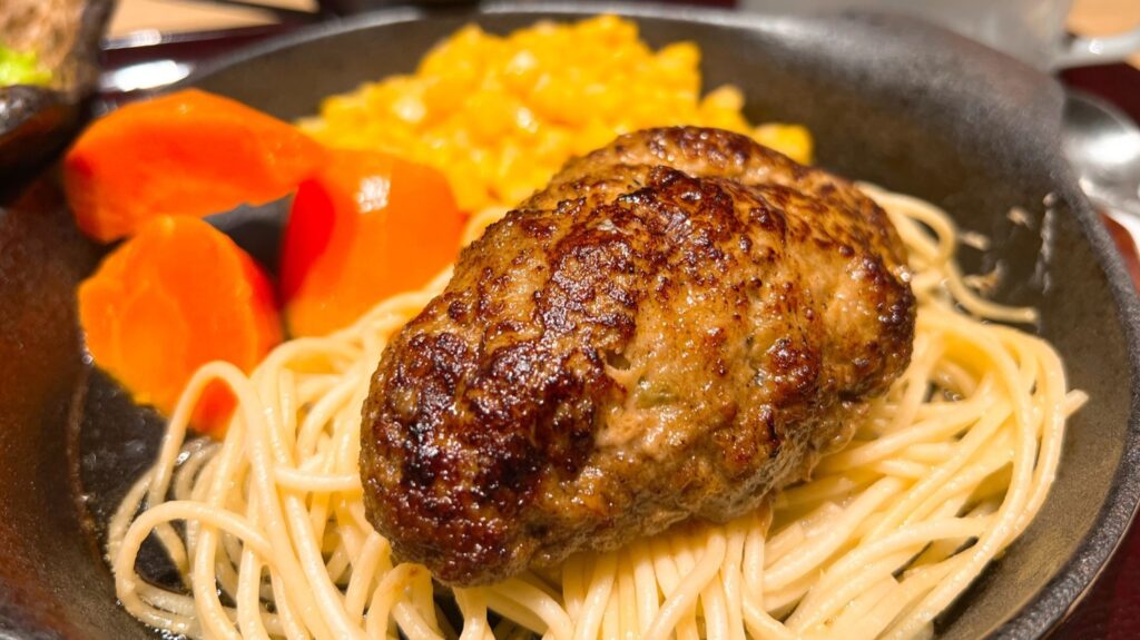 定食にはハンバーグの下に敷かれたスパゲッティに付け合わせの人参とたっぷりのコーン、サラダとお漬物、スープにデザートまでセットとなっています。