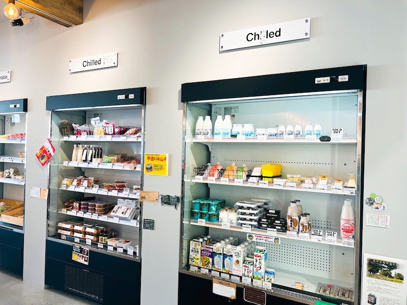 糸島の「伊都物語」をはじめ、豆乳をしようしたスプレット、横山商店のキムチなどチルドコーナーも満載です。