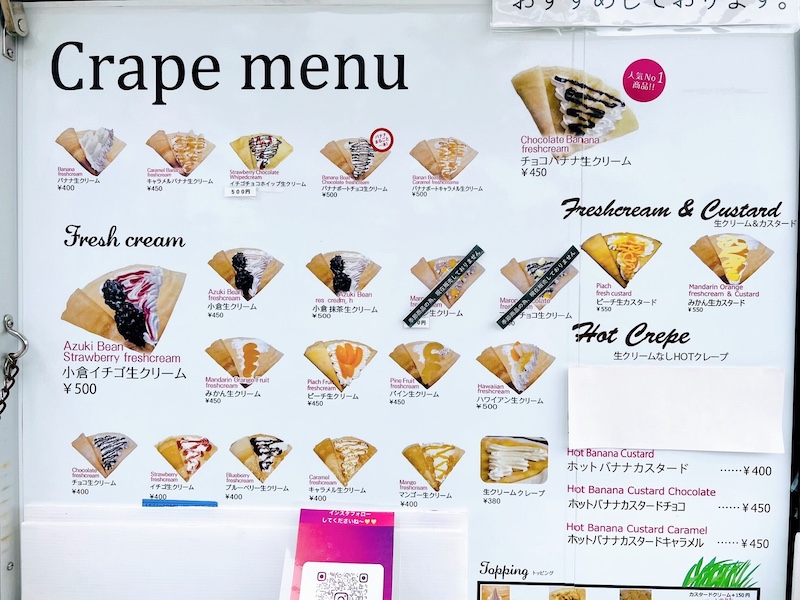 一番のこだわりはもちもち食感の生地!賞味期限は1分と伝えたいほど、作りたてのもちもちの生地は絶品なんです。生地にあわせるのは甘さ控えめの生クリームと旬の果物、何個でもペロッといけちゃうほど食べやすいクレープとなっています!生クリームが苦手な方にはペッパーが効いたパリパリ食感のおかずクレープも提供されていますよ♪(場所によっては販売していない場合あり)