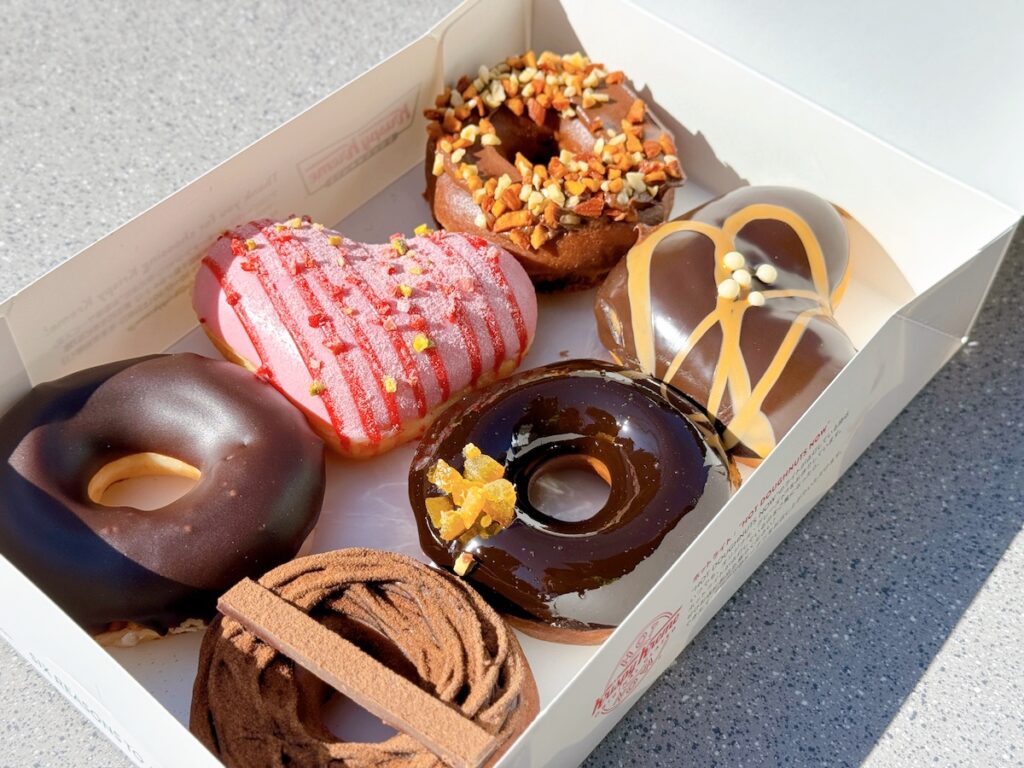 『バレンタイン ダズン ハーフ(6個)』(1,944円・イートイン1,980円)は生チョコ モンブラン、ルビー & ストロベリー、オランジェット リッチ、フォンダン ショコラ リッチ、ジャンドゥーヤ クリームのバレンタイン限定ドーナツ5種に、定番のチョコレート グレーズドがセットになっています。