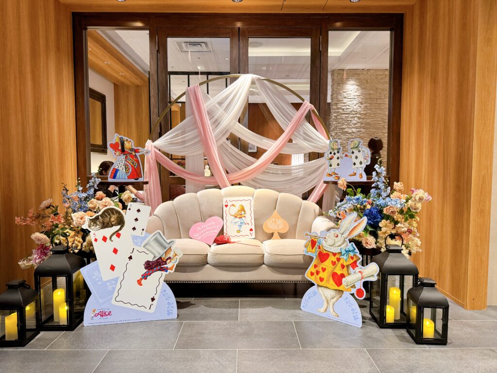 入り口には今回のコラボレーションのための装飾が……!空間からアリス一色でテンションもあがっちゃいますね。
