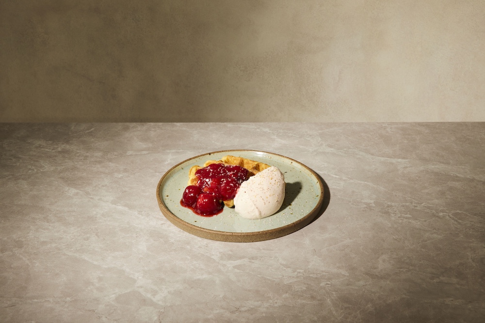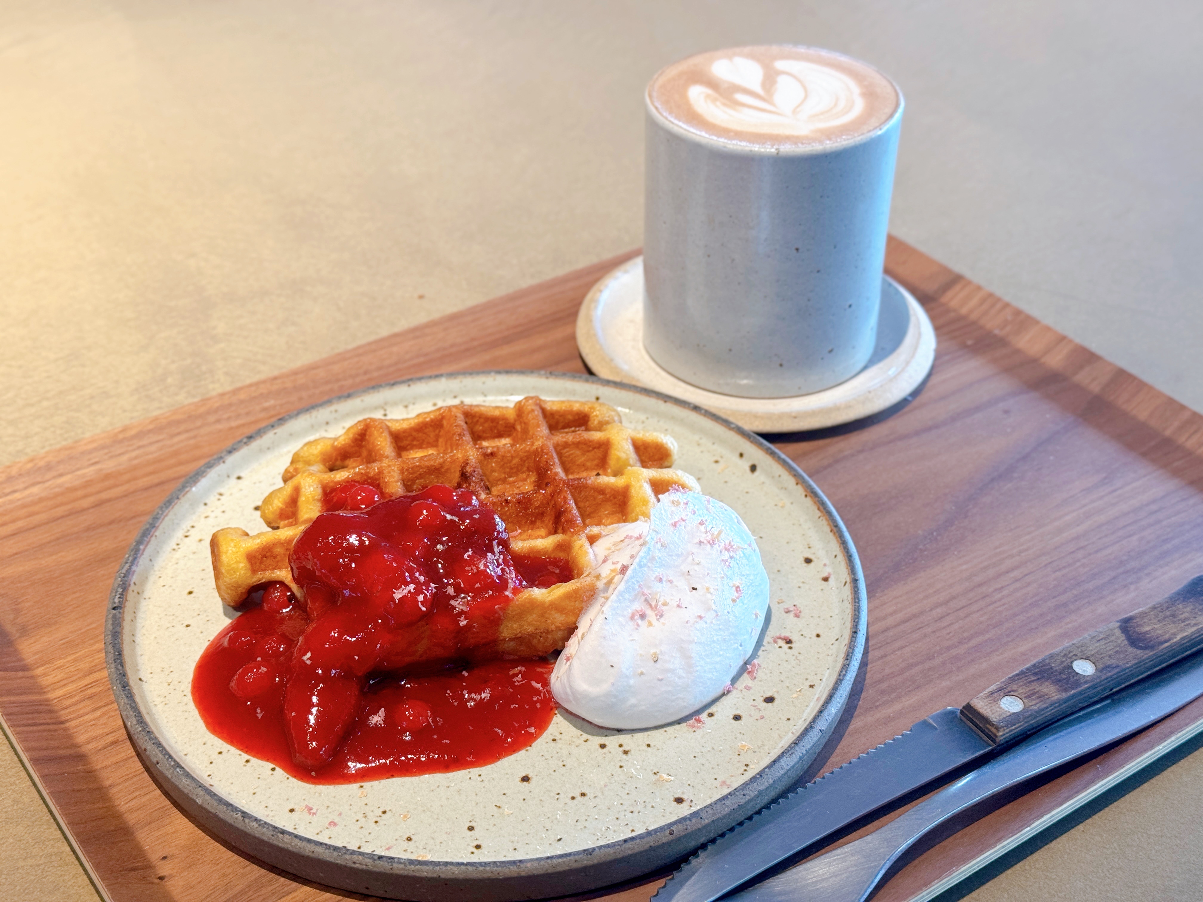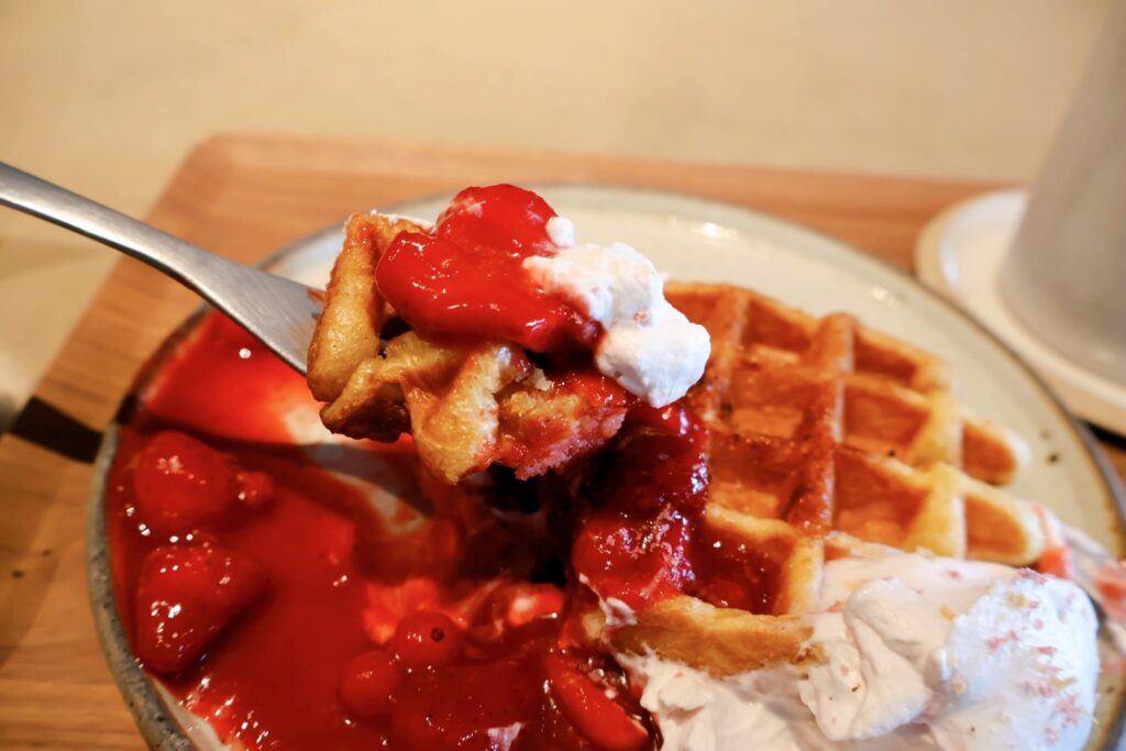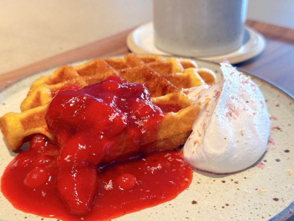 店内で焼き上げる熱々のリエージュ ワッフルの上に、ストロベリーとフランボワーズのソース、そしてフレッシュな果肉がたっぷりのっています。