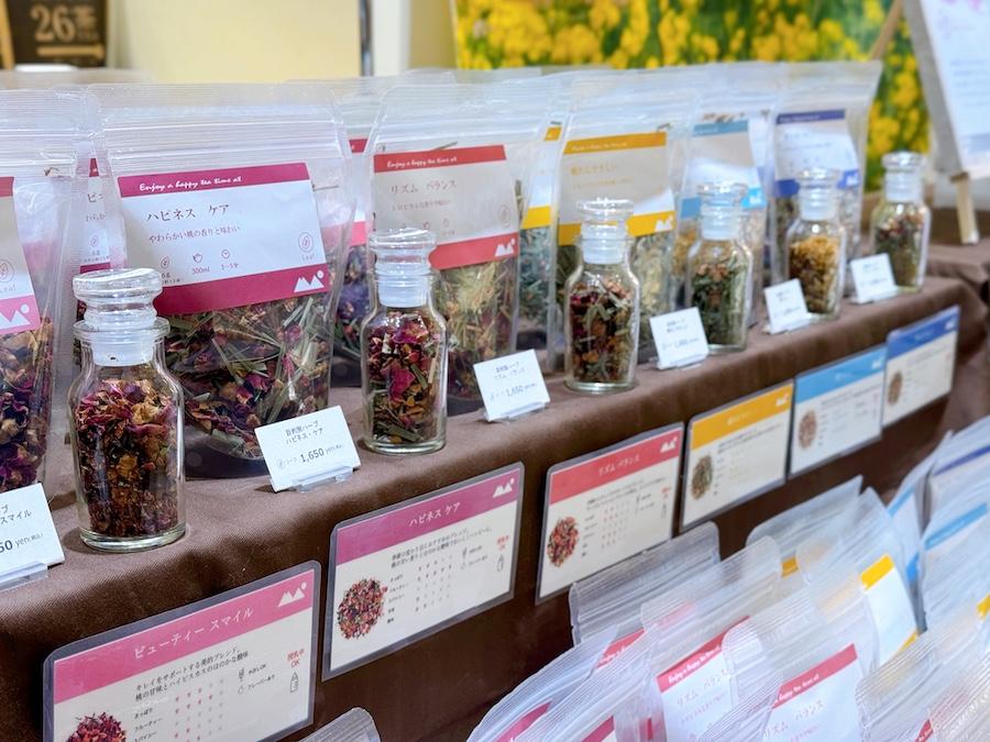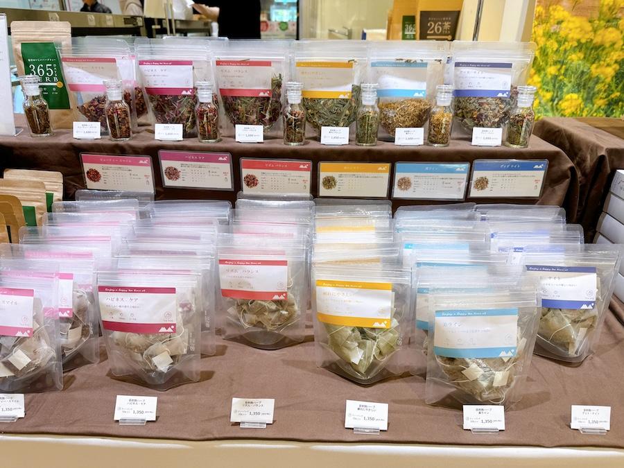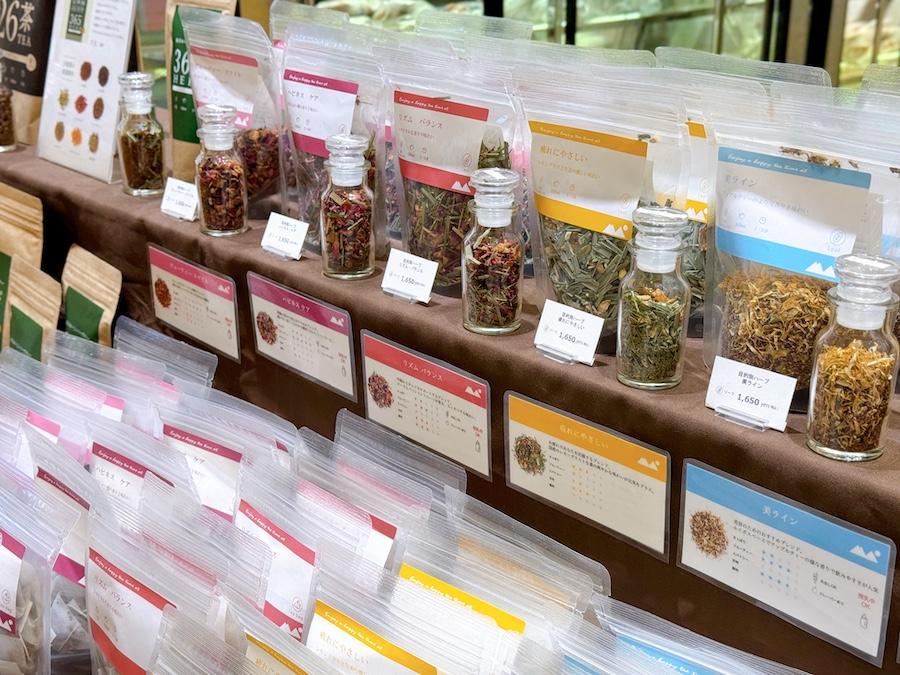 商品は手軽なティーバッグタイプと本格的に楽しみたいリーフがあります。「リフレッシュ」「リラックス」「ビューティー」など、その時の気分や体調に合わせたテーマ別のブレンドが揃っています。