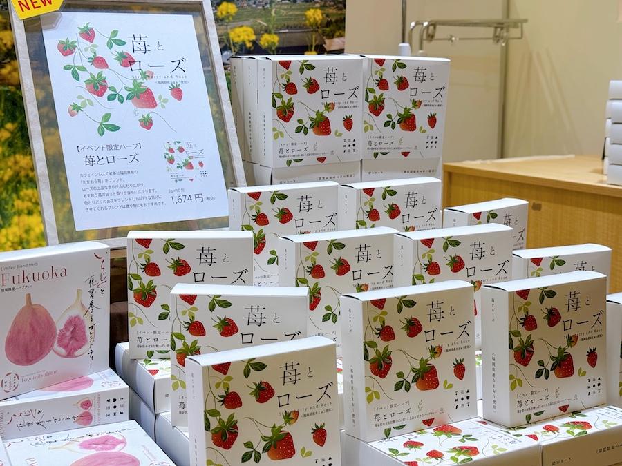 博多エキナカマイングでの出店は大好評につき2月15日(日)まで継続出店が決定しました!さらに2月1日頃からは当催事限定季節商品の「苺とブルーベリー」とバレンタイン・ホワイトデー限定商品の「Happiness Day」が入荷予定で、現在販売中のあまおう苺やいちじくの季節限定ハーブに加え増々楽しみなラインナップとなりそうです!