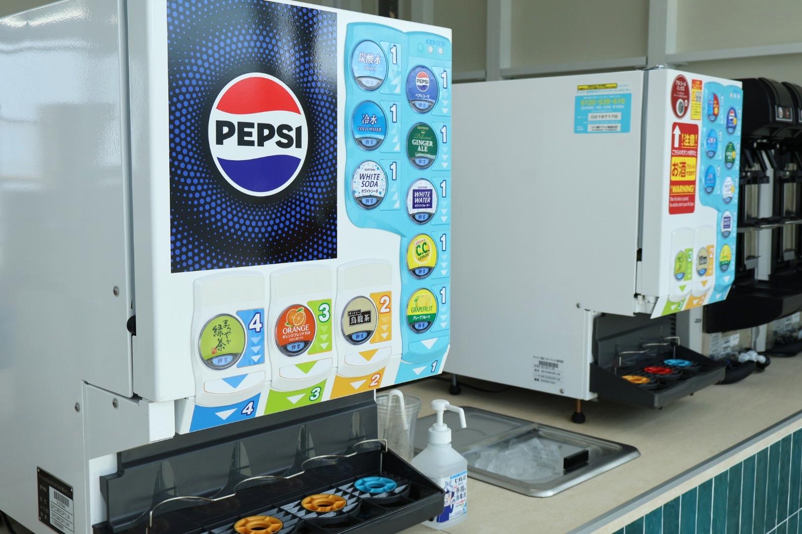 店内中央エリアにはセルフドリンクのドリンクバーがあります。