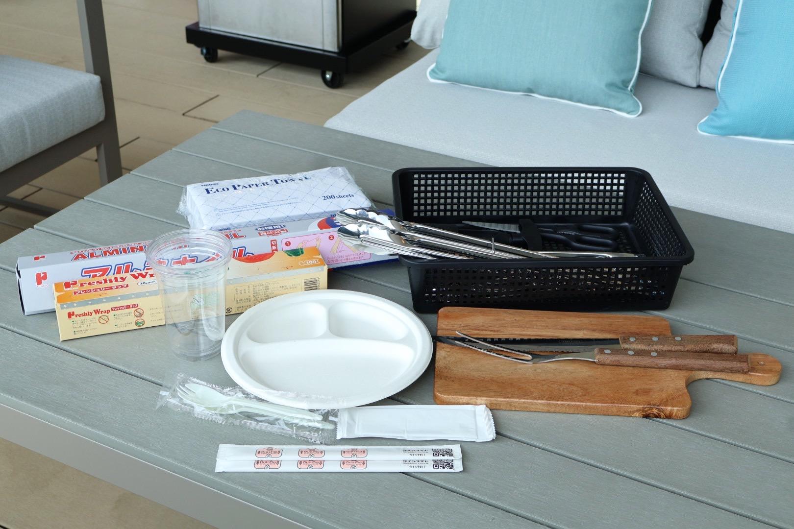 各テーブルにはトングやアルミホイルなどの備品やお皿、スプーン、お箸なども全て揃っていますよ。