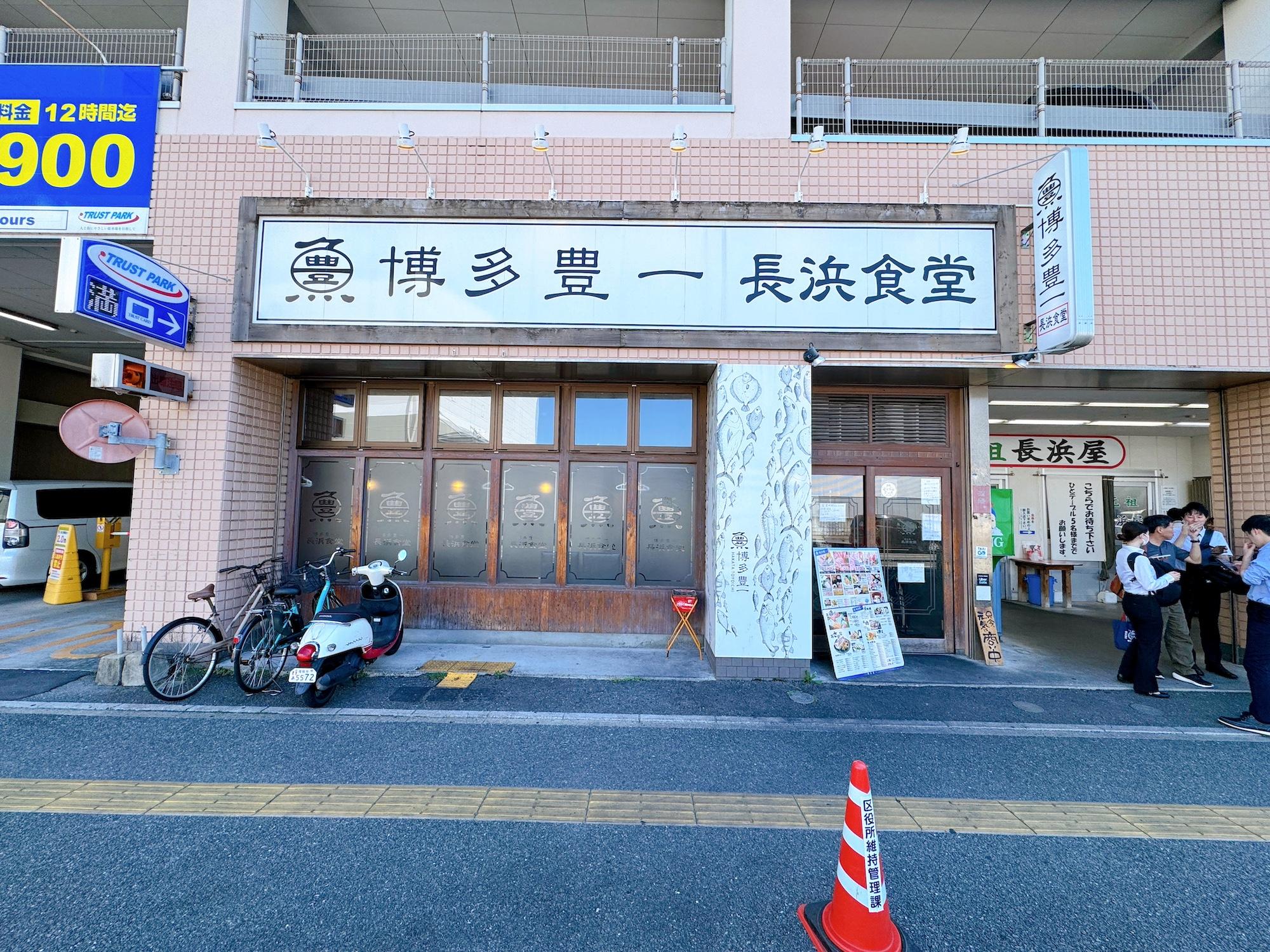 「博多豊一 長浜食堂」があるのは福岡市中央区長浜。道を挟んだ目の前には「長浜鮮魚市場」があり、隣にはラーメンの人気店「元祖長浜屋」が。