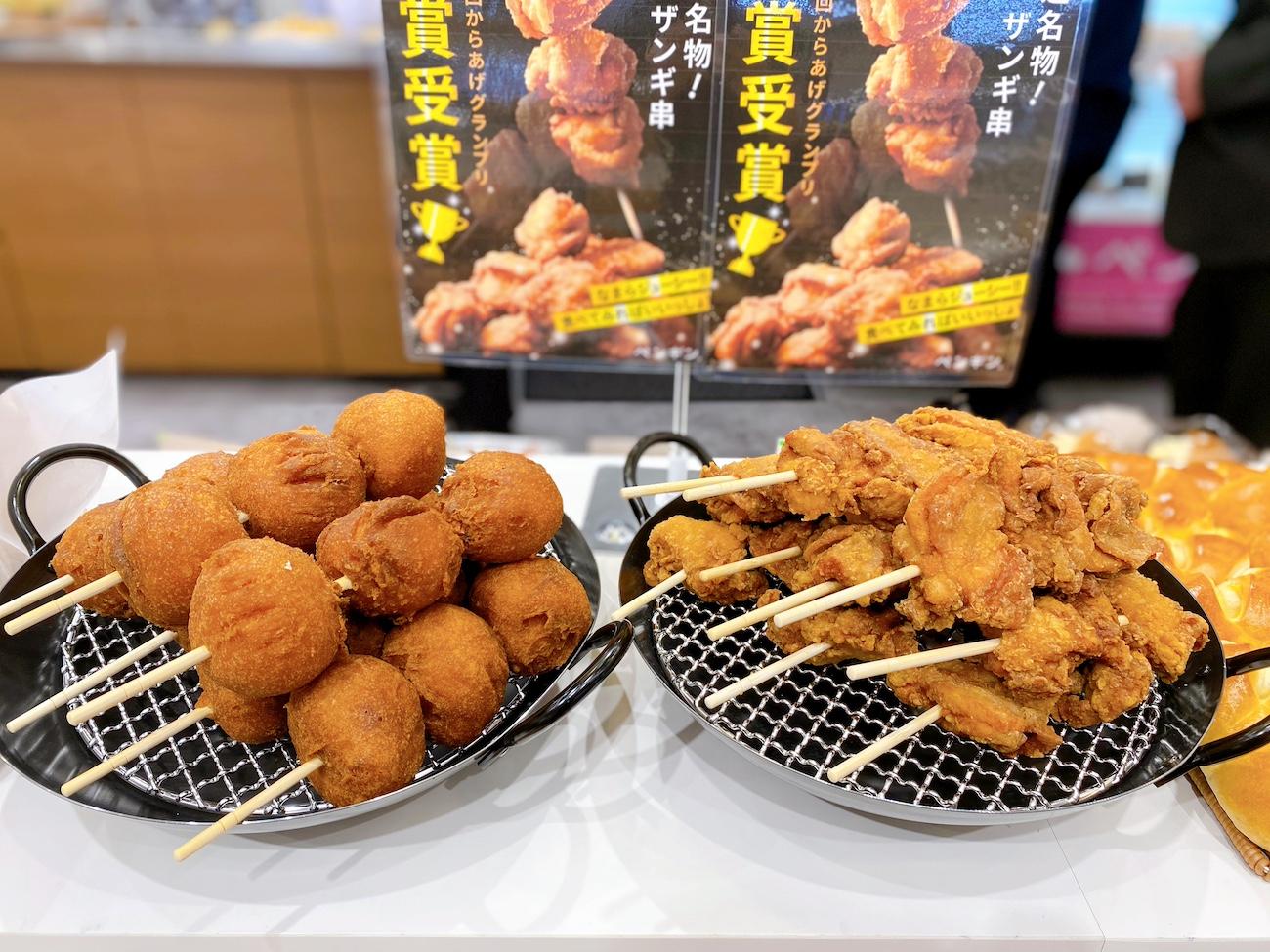 「北海道名物!ザンギ串(1本390円)・右」は、日本で一番うまい唐揚店を決める『からあげグランプリ(R)』で、全国753店の唐揚げ店がエントリーするなか唯一パン屋さんで金賞を受賞したという驚きのメニューです。