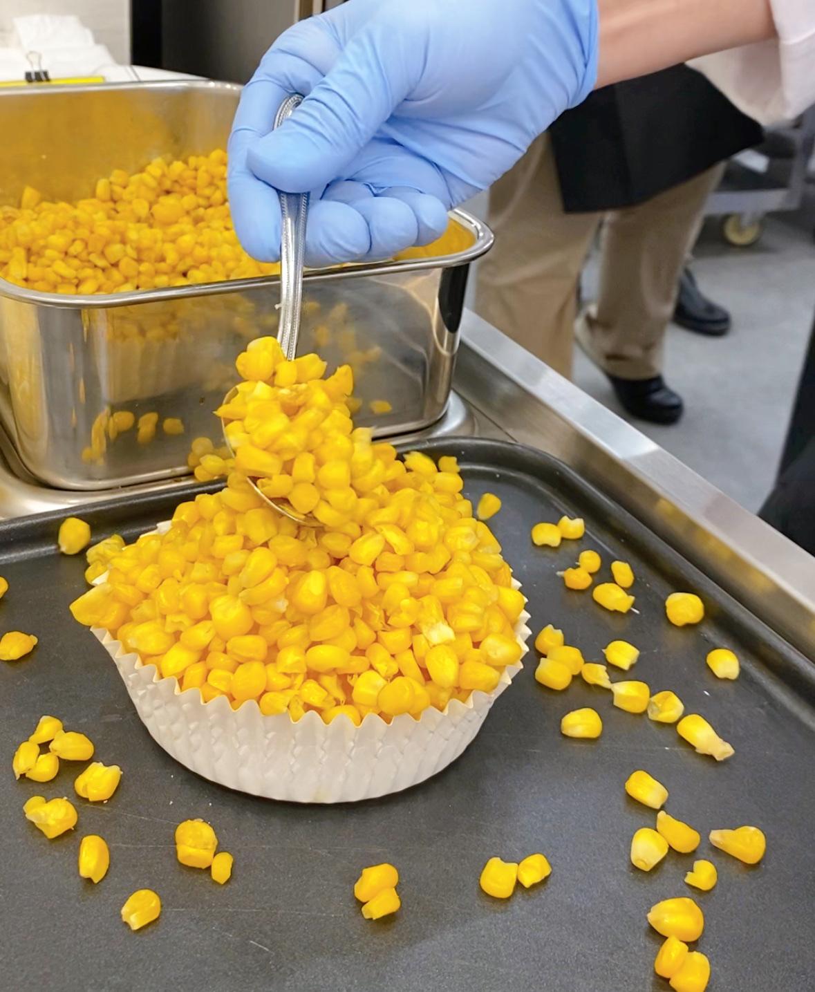 スタッフの『よいしょ〜〜!!』の威勢の良い掛け声と共に、とうきびがどんどんパンに盛られていきます。