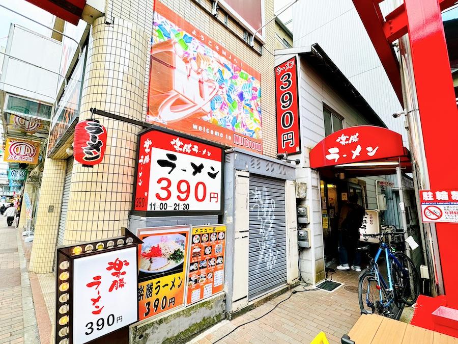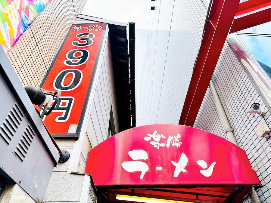 すぐ横にはゲームセンターの「タイトーステーション福岡天神店」があり、路地の入り口には「楽勝ラーメン390円」の文字が。この文字を見るとつい足が向いてしまいますね。