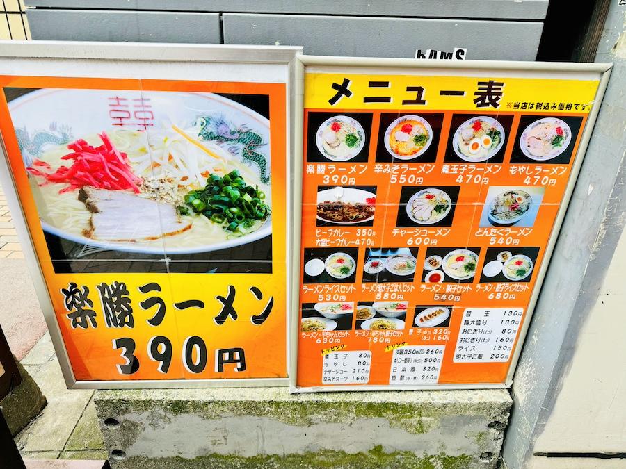 こちらがメニュー。「楽勝ラーメン(390円)」のほか、「辛みそラーメン(550円)」や博多を感じられるような「どんたくラーメン(540円)」、ラーメン屋としては珍しい「ビーフカレー(350円)」もありましたよ。どれも安い…!!
