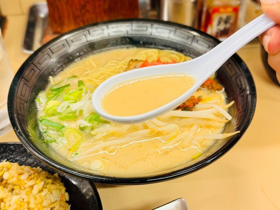 まずはスープをひとすすり。甘みのある豚骨スープはクリーミーで、しっかりとした満足感のある味わいです。麺ともしっかり絡んで美味しい!