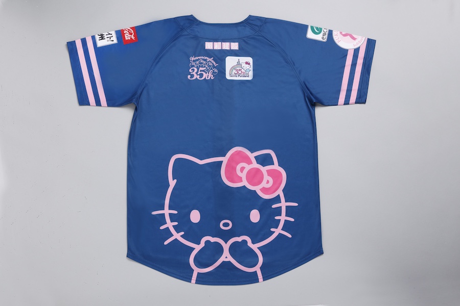 配布される「ハローキティ ピンクフル限定ユニフォーム」は、背面にハローキティがプリントされたキュートな一着。ベースカラーは落ち着いたダークネイビーとなっており、ピンクとのコントラストが映える、老若男女問わず着用しやすい「かっこいい×かわいい」デザインに仕上がっています。