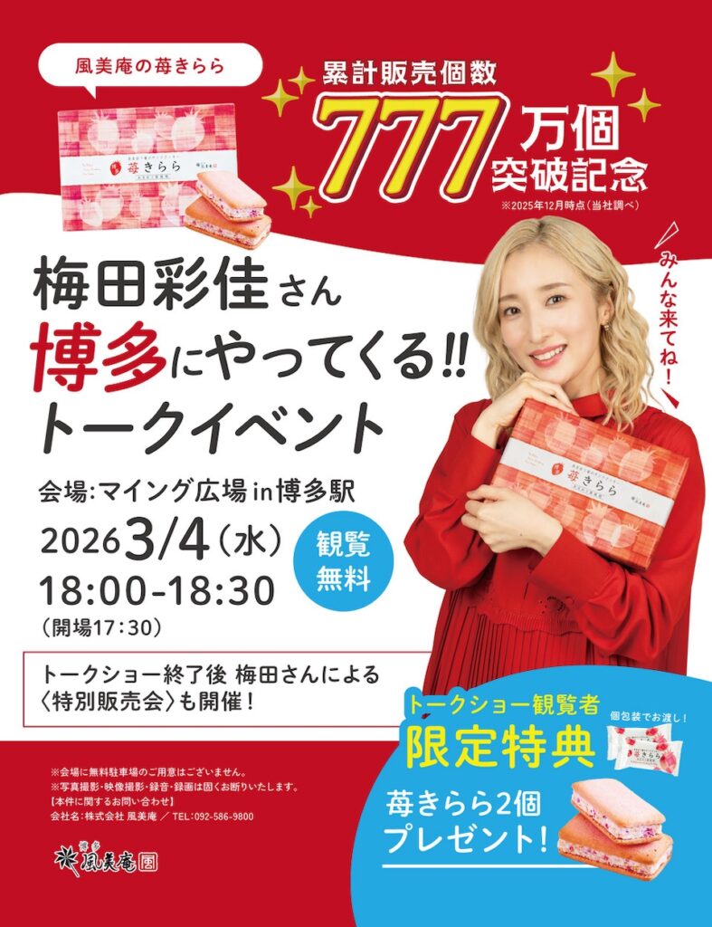 今回の記念キャンペーンの目玉として、3月4日(水)に博多駅のマイング広場にて梅田彩佳さんのトークショーが開催されます。観覧は無料で、トークショー終了後には梅田さん本人による特別販売会も実施予定。さらに、トークショー観覧者限定で「苺きらら」を2個プレゼントという特典も用意されています。