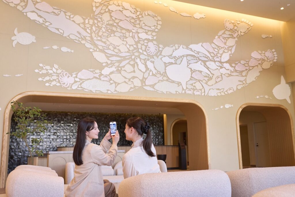 1階ロビーでゲストを迎えるのは、中村人形・4代目 中村弘峰氏による巨大な壁画「Prince of the Ocean」。横幅12mにも及ぶこの作品は、よく見ると555匹もの海の生き物で一人のプリンスが構成されており、QRコードを読み込んでスマートフォンをかざすとARで作品の世界が動き出すという、デジタルと伝統工芸が融合した新しい体験も楽しめます。