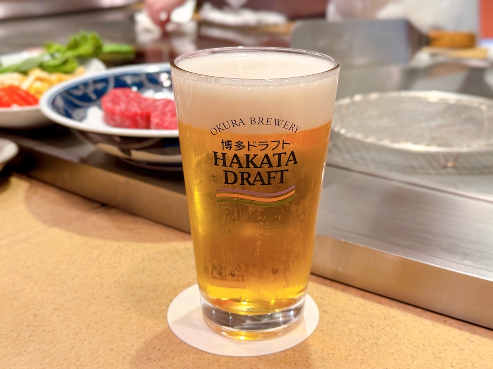 お供には、ホテル館内の醸造所で造られたクラフトビール「博多ドラフト」がおすすめ!できたてならではの鮮度と深い味わいは、贅沢な鉄板焼の味を一層引き立ててくれます。