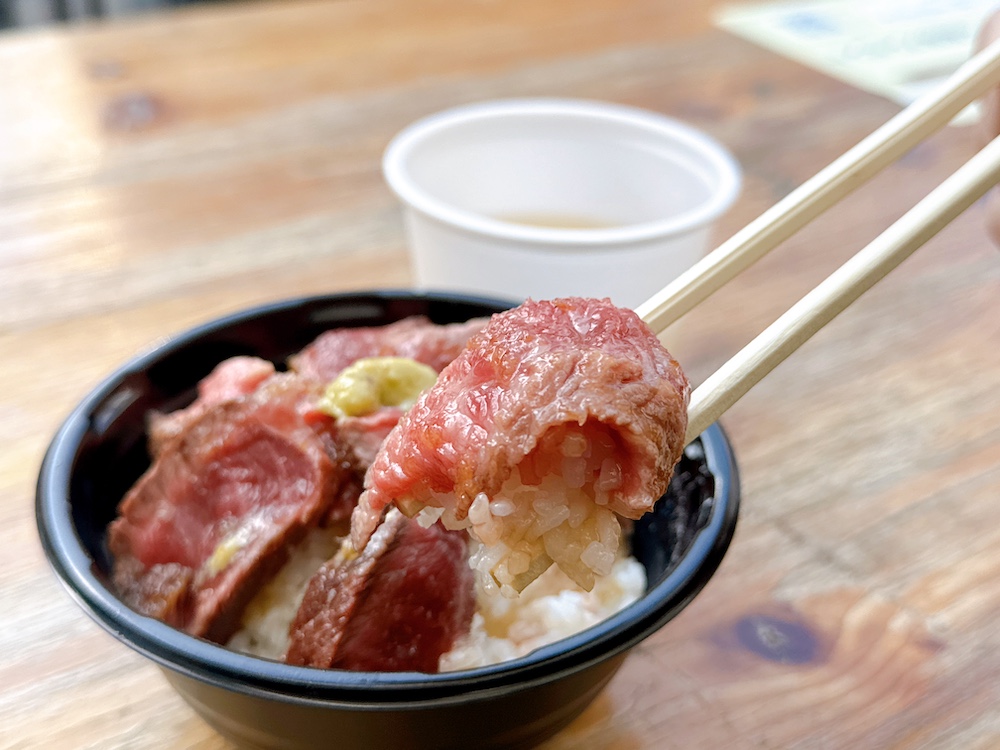 こちらは「焼肉のひみつ基地×鹿児島黒牛」の『大トロステーキ丼(4にっくん)』。トロッととろける食感の鹿児島黒牛は口に運んだ瞬間お肉の旨みがジュワッと溢れ出します。