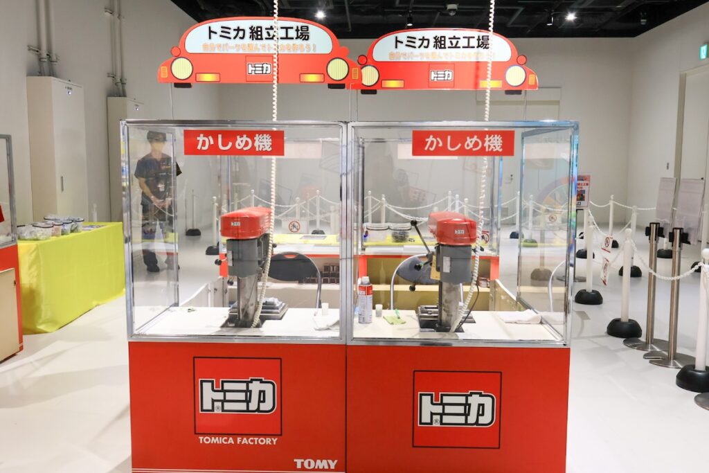 そして見逃せないのが「トミカ組立工場(1回900円)」です。自分の好きな車種の、好きな色のパーツを選ぶと、なんと「カシメマン」が目の前で専用の機械を使って組み立ててくれるんです!目の前でトミカが完成してくれる経験は特別な思いでとなりそうですね♪