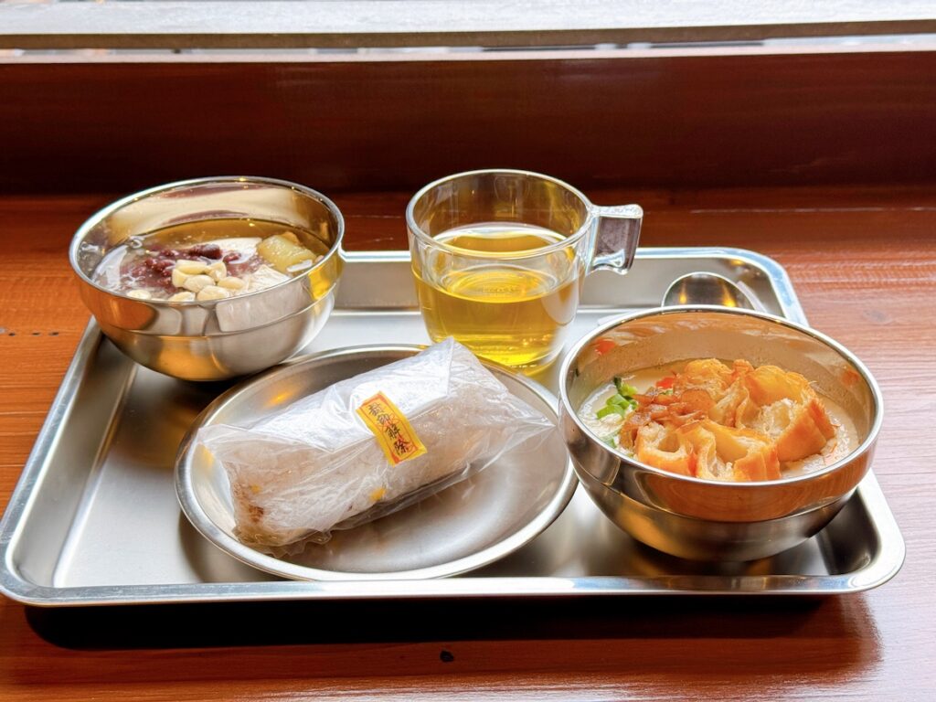 今回試食させていただいたのは、台湾の定番朝ごはんである「飯糰(ファントン)セット(1,430円)」。おにぎり、豆花、台湾ティーに加えて、看板メニューである豆乳スープ「鹹豆漿(シェントウジャン)」がセットになっています。