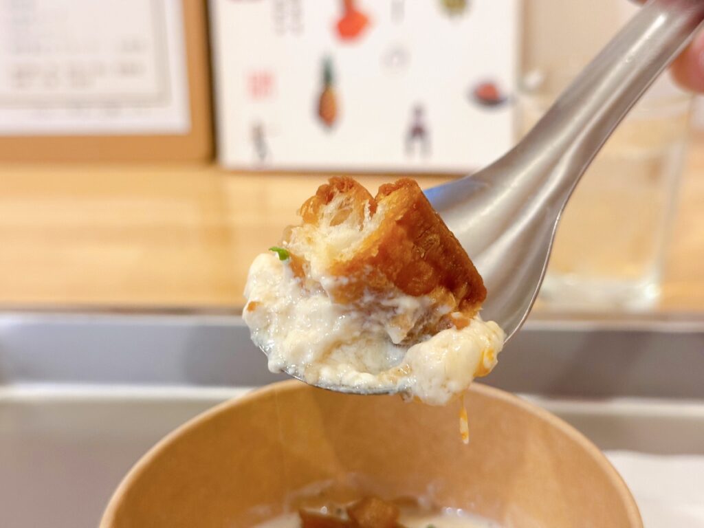 トッピングされたサクサクの揚げパン(油条)がスープを吸ってじゅわっとした食感に変わるのも楽しく、ラー油のピリ辛さが絶妙なアクセントに。大豆の雑味が全くなく、非常にクリアで優しい味わいで、胃袋をじんわりと温めてくれる最高の一杯でした。