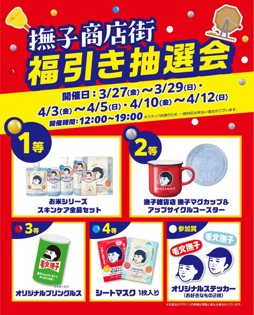 1等はなんと「毛穴撫子」お米シリーズのスキンケア全品セット!その他にも、撫子ちゃんのオリジナルマグカップやコースター、プリングルスなどの豪華な非売品グッズが当たるチャンスです。毛穴撫子シリーズを1,000円(税込)以上購入するか、西鉄福岡(天神)駅〜天神ロフト周辺で配布されている福引き券を提示することで参加できます。