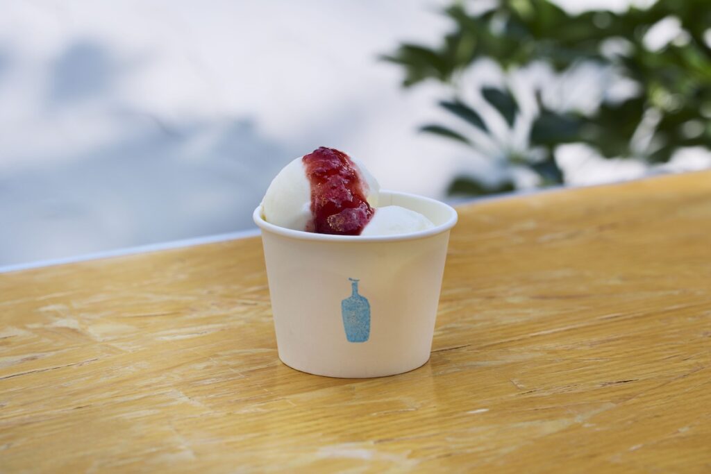 クラフトアイスクリームブランド「HiO ICE CREAM」の濃厚なミルクアイスに、甘酸っぱいいちごジャムをトッピング。初夏の風を感じながら味わいたい、ここだけの限定デザートです。