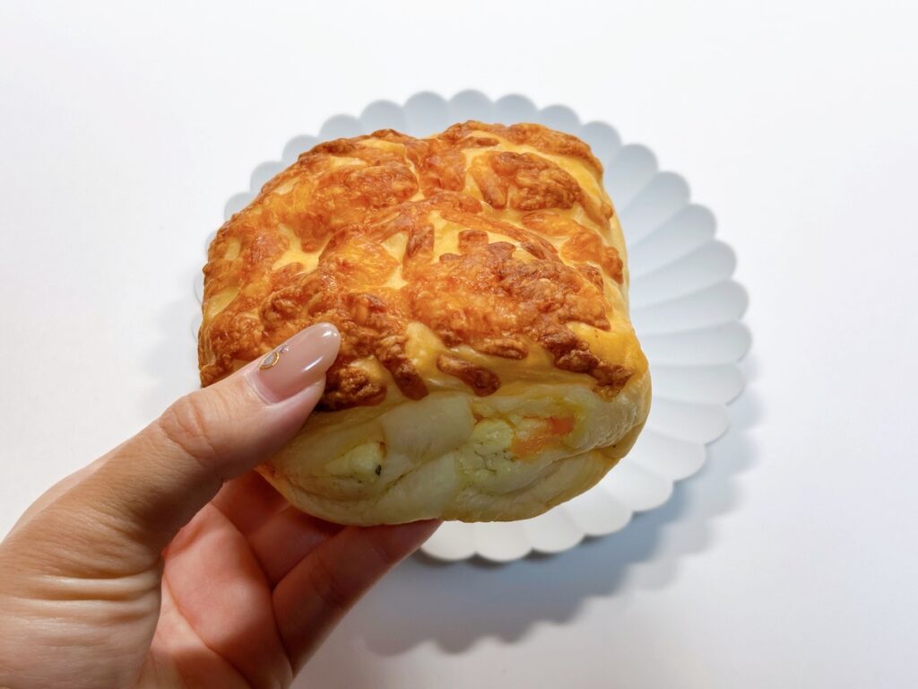 中には角切りチーズが入ったなめらかなチーズクリームが包まれており、チーズのコクと程よい塩気がたまりません。もっちりとした生地との相性も抜群で、甘いものが苦手な方や小腹が空いた時の軽食としても大満足できる一品です!
