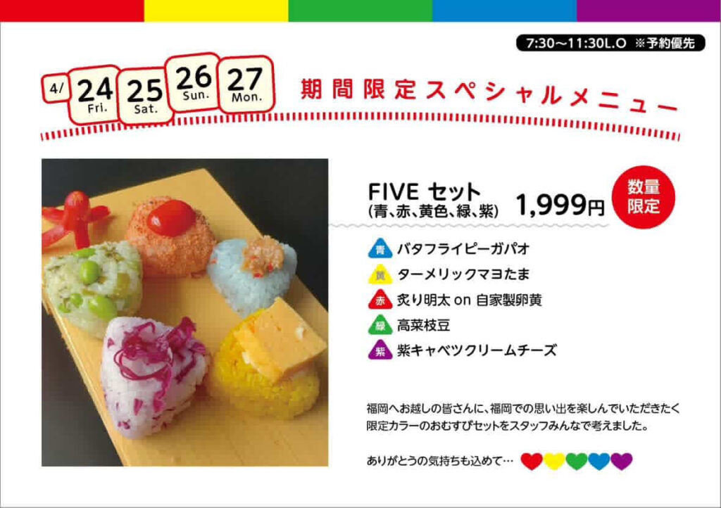 2026年4月24日(金)からの4日間限定で、中央区西中州にある「おむすび横丁」にて特別な5色のおむすび「FIVEセット」が販売されます。オーナーやスタッフの愛が詰まった限定セットをご紹介します。