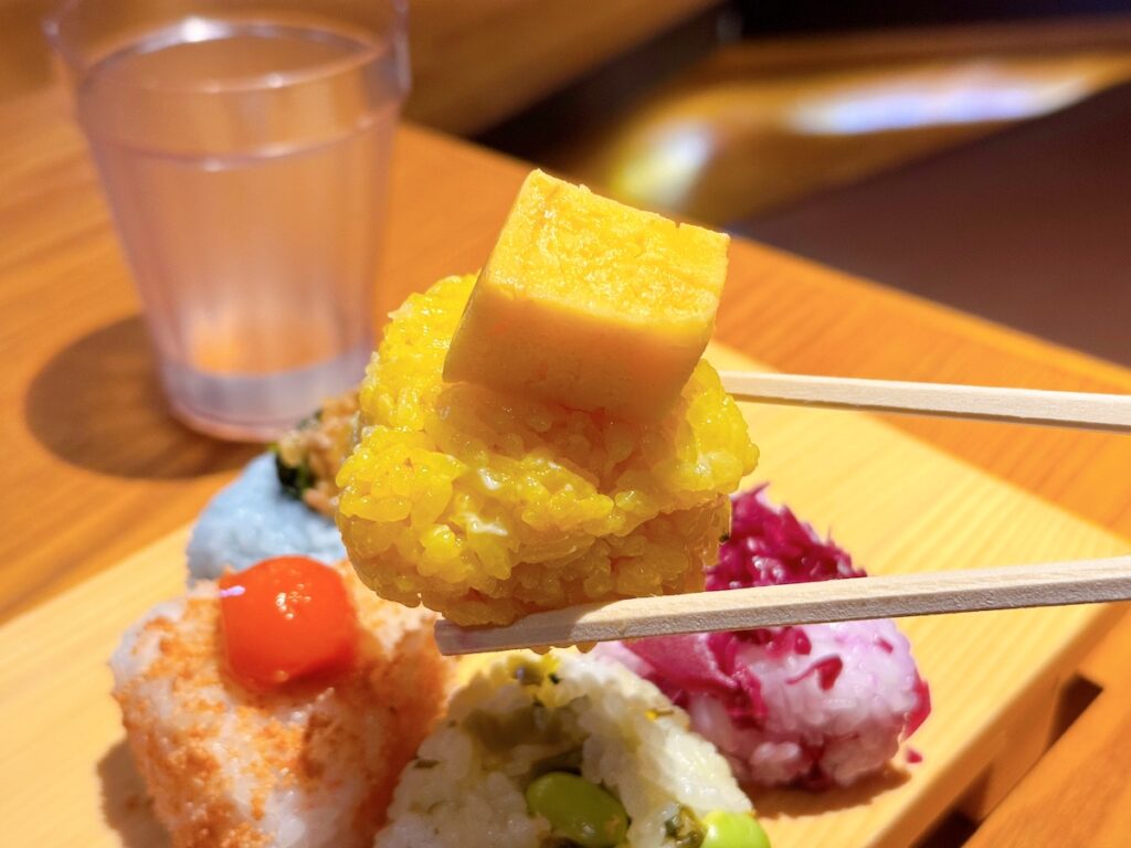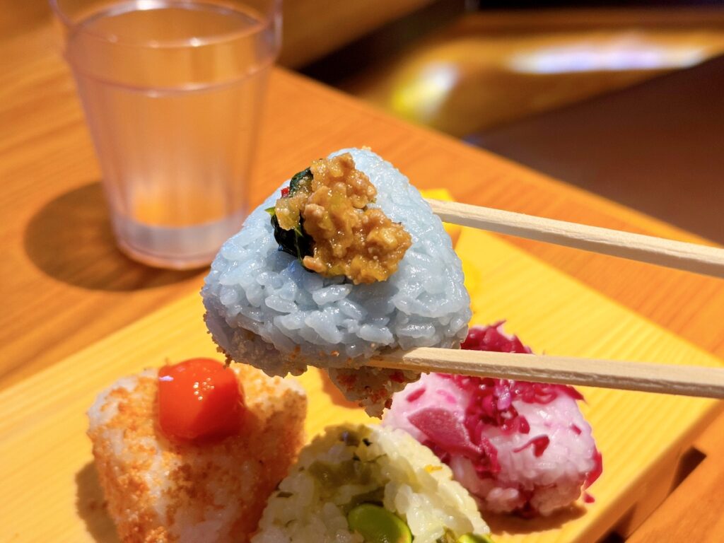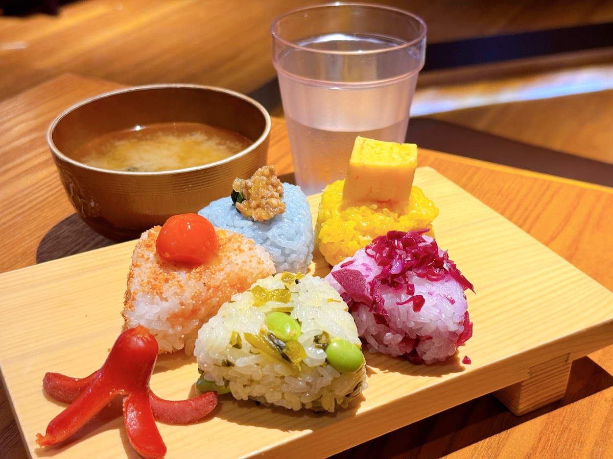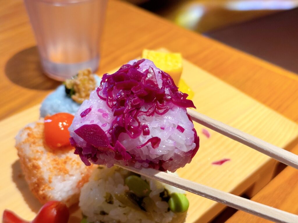 目の前に現れたのは、まるで絵の具のパレットのように鮮やかな5つのおむすび。青、黄、紫、緑、赤が表現された、期間限定の特別なおむすびです。