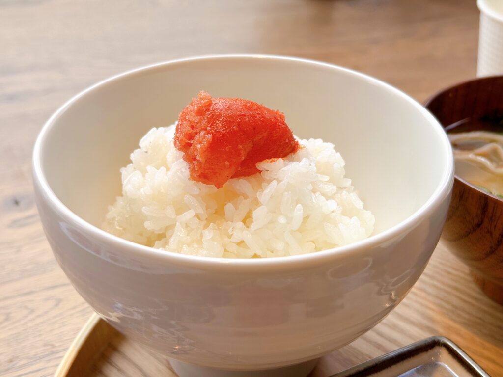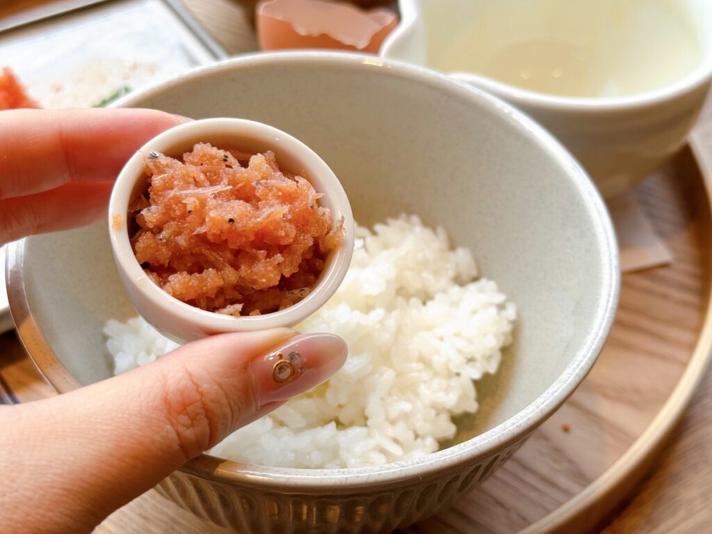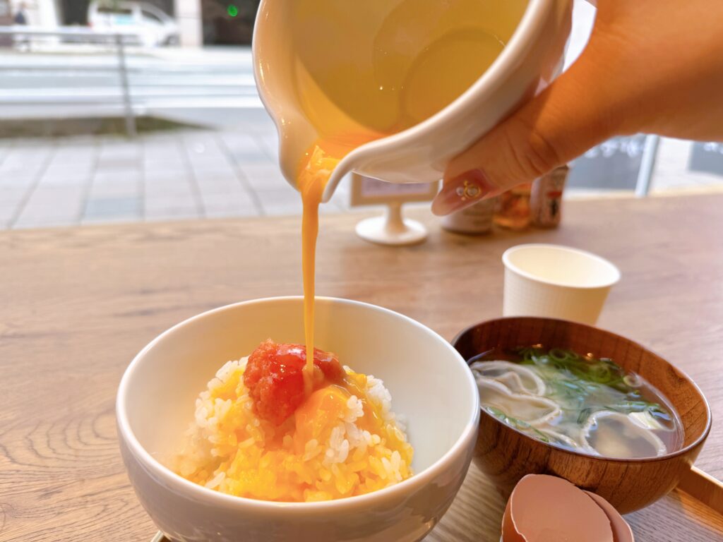 さらにはセットの卵を割ってご飯にかけると、黄身のまろやかさが明太子の辛味を包み込んで旨味がさらに一段とアップ!ご飯はセルフサービスで1杯までおかわりOKなので、おいしい明太子を前にご飯が止まらなくなること間違いなしです♪