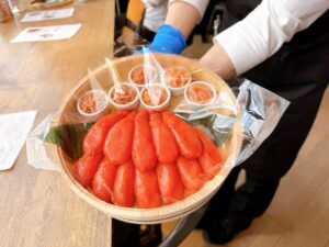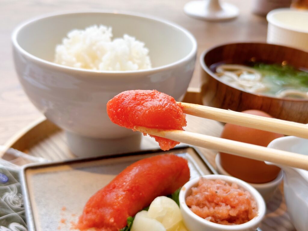 席で待っていると、スタッフの方が丸ごと一本の明太子を目の前でサーブしてくれます。このライブ感も特別に感じられ、地元民はもちろんのこと観光客にもきっと喜んでもらえること間違いなしです!