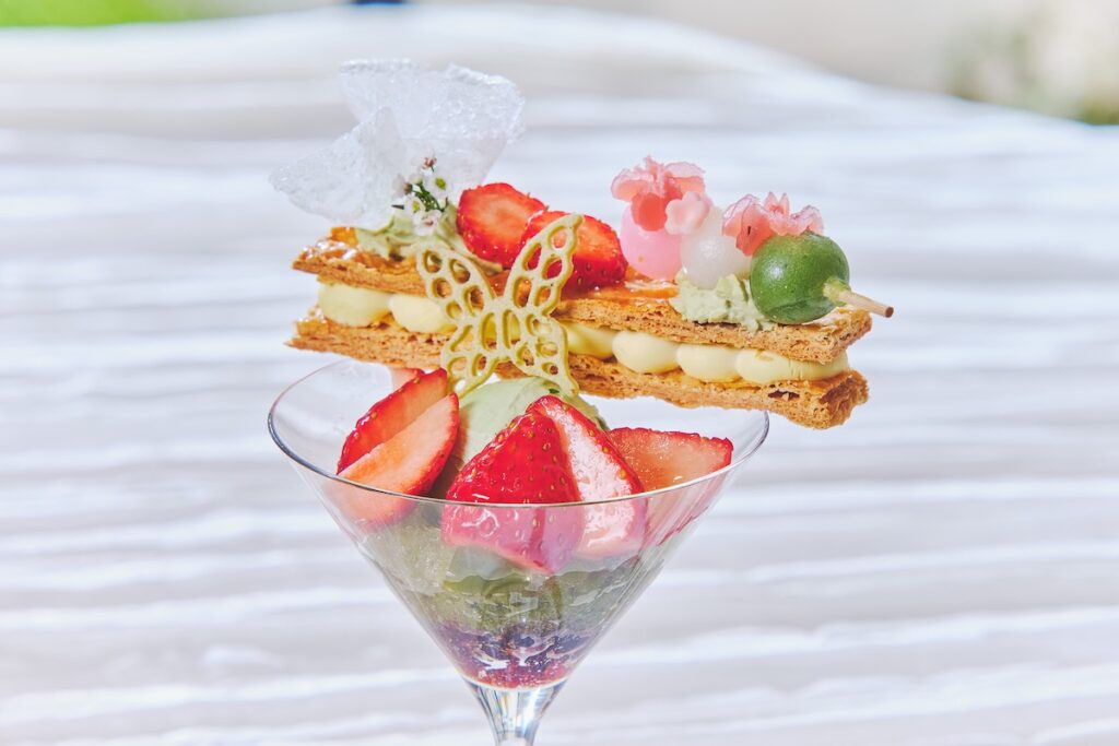 さらにより贅沢を楽しみたい方には、オプションのスペシャルデザート「いちごと抹茶のミルフィーユパフェ(1,800円)」もおすすめ。宇治抹茶のアイスや三色団子を合わせた、新緑の息吹を感じられる華やかな一品です。