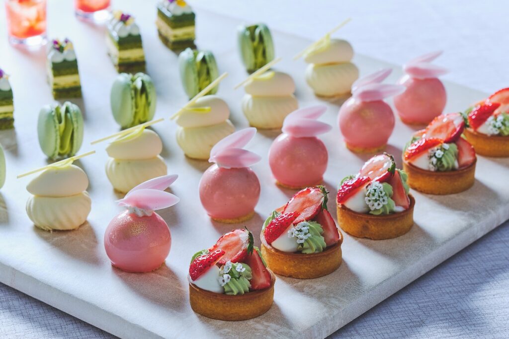 鮮やかな「いちごと抹茶のタルト」、グリーンが美しい「抹茶のマカロン」。