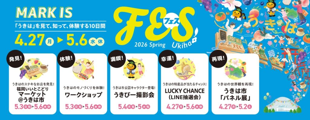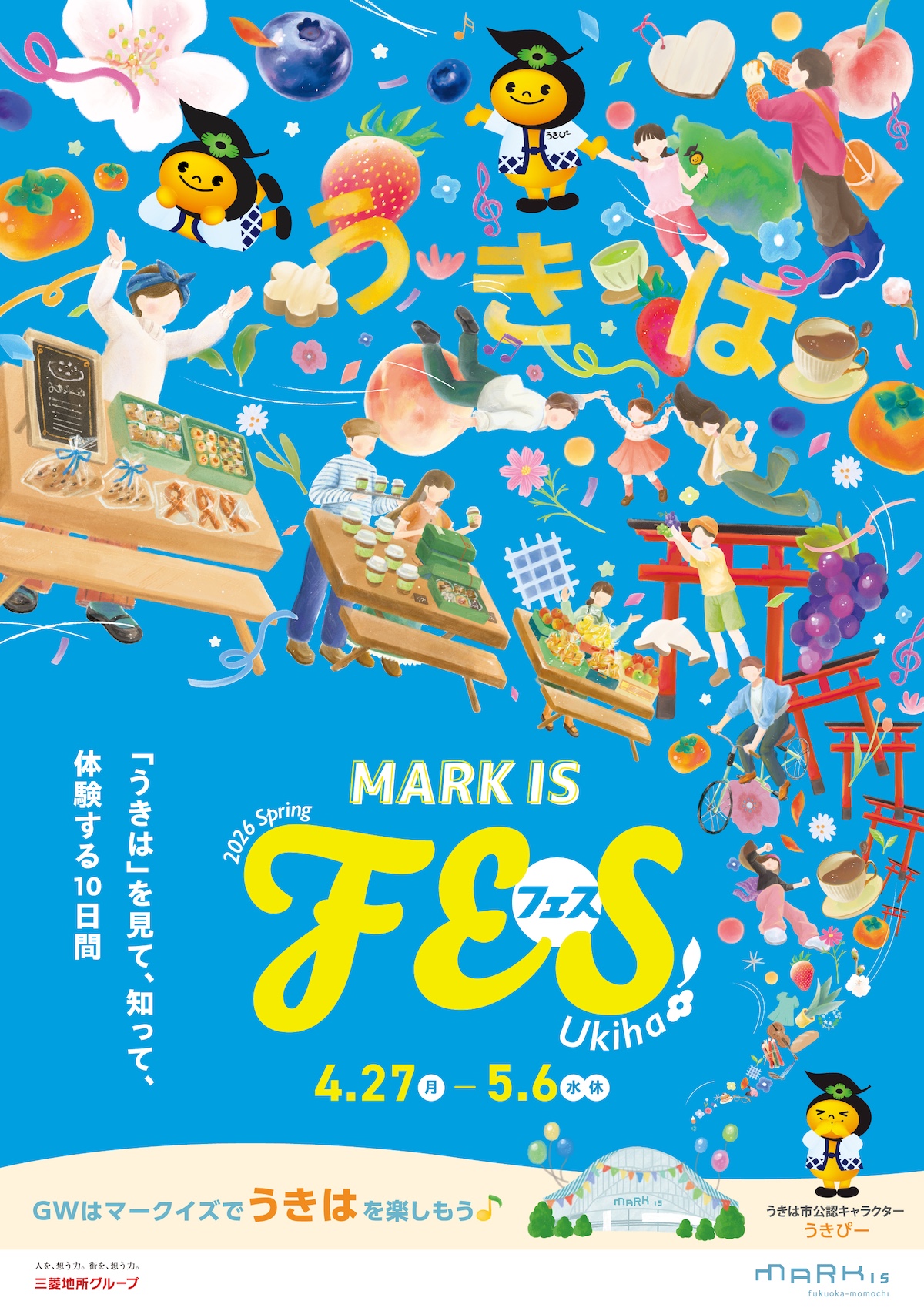 2026年のゴールデンウィークは近場でおでかけを満喫!MARK IS 福岡ももちで、4月27日(月)から5月6日(水・休)まで「MARK IS FES! ~discovery Fukuoka~」が開催されます。今年のテーマはフルーツとクラフトのまち「うきは市」。福岡の新しい魅力に出会える、大注目の10日間となっていますよ!