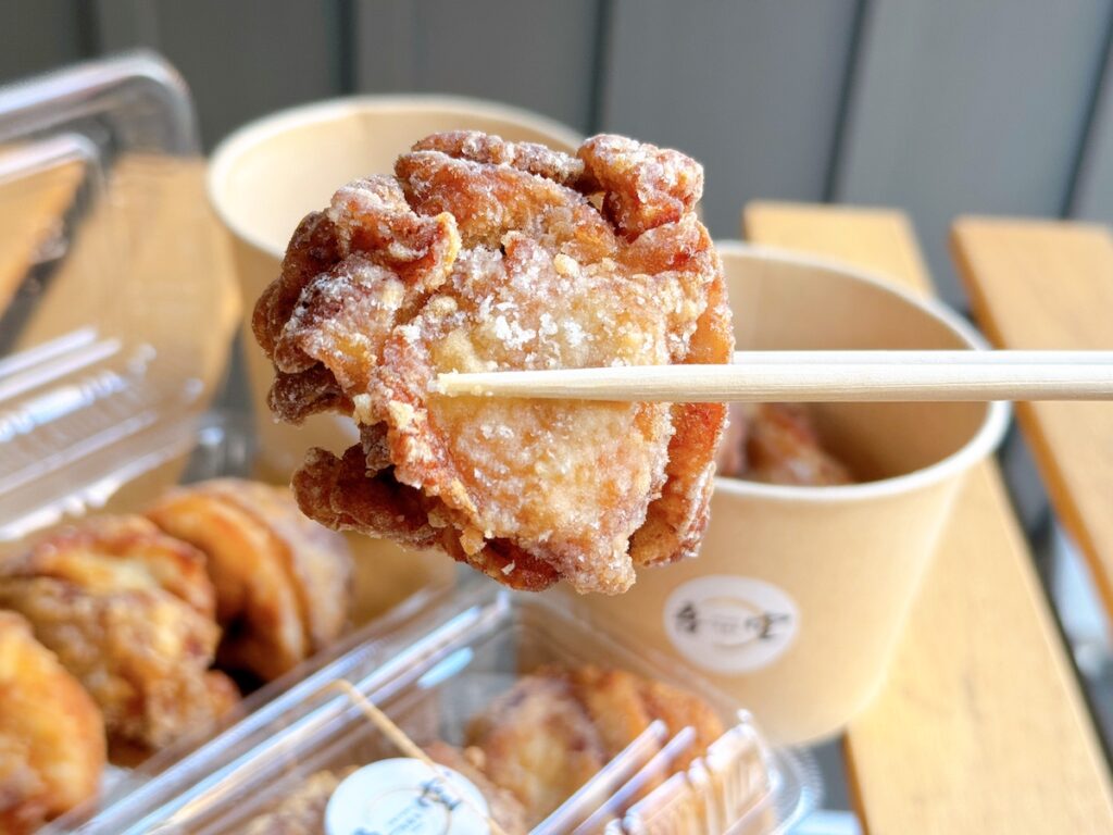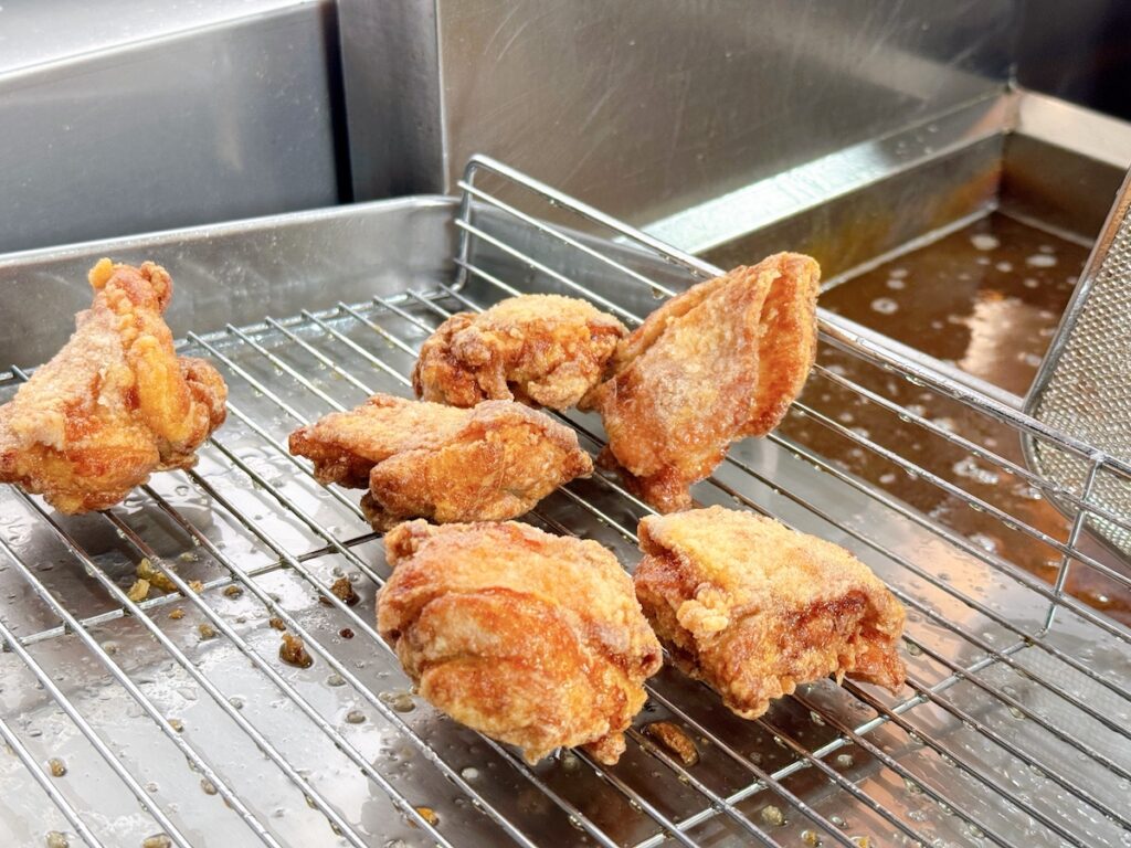 注文を受けてから、一度揚げて休ませ、再度揚げる“二度揚げ”を行うことで、外はカリッと、中は肉汁が溢れ出すジューシーな食感を実現しています。この手間を惜しまない丁寧な仕事こそが、冷めてもおいしい極上の唐揚げを生み出しています。