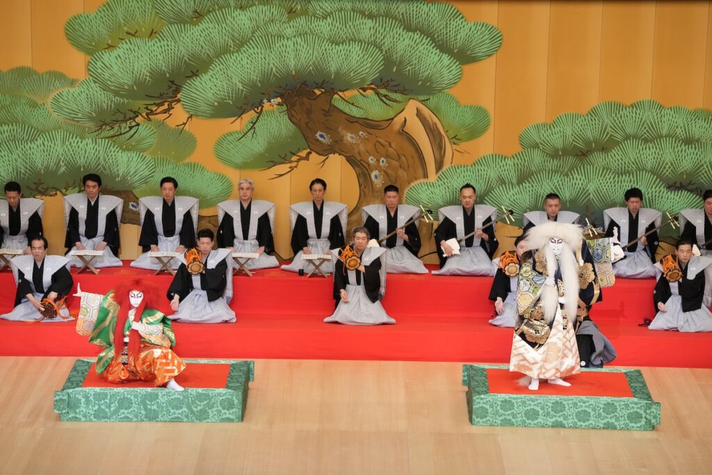 裃(かみしも)姿の俳優たちが揃う晴れやかな「襲名披露 口上(こうじょう)」の後は、大トリを飾る大注目の「連獅子(れんじし)」。豪快な毛振りは圧巻のみどころとなっています。
